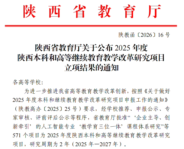 近日,陕西省教育厅发布了《关于公布2025年度陕西本科和高等继续教育教学改革研究项目立项结果的通知》(陕教函〔2026〕16号),beat365申报的《经管类专业“AI交互情境赋能五阶能力递进”专创融合模式研究与实践》...