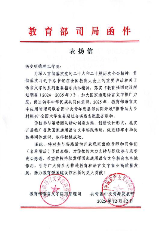 近日,学校收到教育部语言文字应用管理司与共青团中央青年发展部联合印发的表扬信,对“心相通·语先行”赴新疆若羌推普实践队在2025年“推普助力乡村振兴”全国大学生暑期社会实践志愿服务活动中的突出表现予以高度...