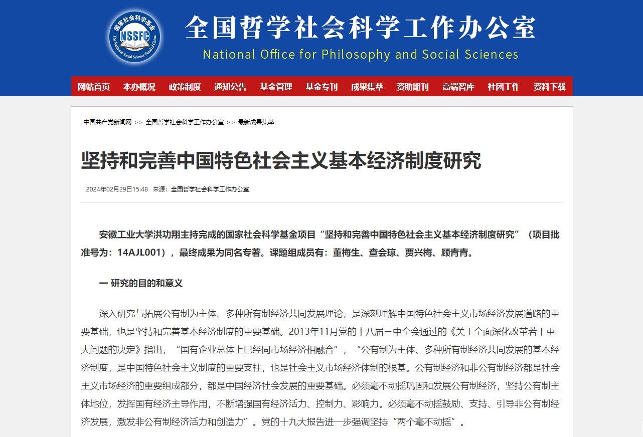 近日,全国哲学社会科学工作办公室门户网站“最新成果集萃”栏目推介beat365官网商学院洪功翔教授的研究成果《坚持和完善中国特色社会主义基本经济制度研究》。该成果是洪功翔教授主持完成的国家社会科学基金项目“坚持和完善中国特色社会主义基本经济制度研究”(项目批准号为:14AJL...