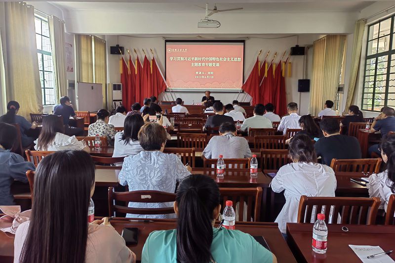 6月2日下午,校党委常委、副校长刘明在马克思主义学院三楼报告厅为分管部门党员干部讲授主题教育专题党课。财务处、资产处、基建办、后勤处、睿安公司等单位科级及以上人员,财务处党支部和校医院党支部全体党员参加党课学习。刘明结合个人学习体会和分管工作实际,按照“四个...