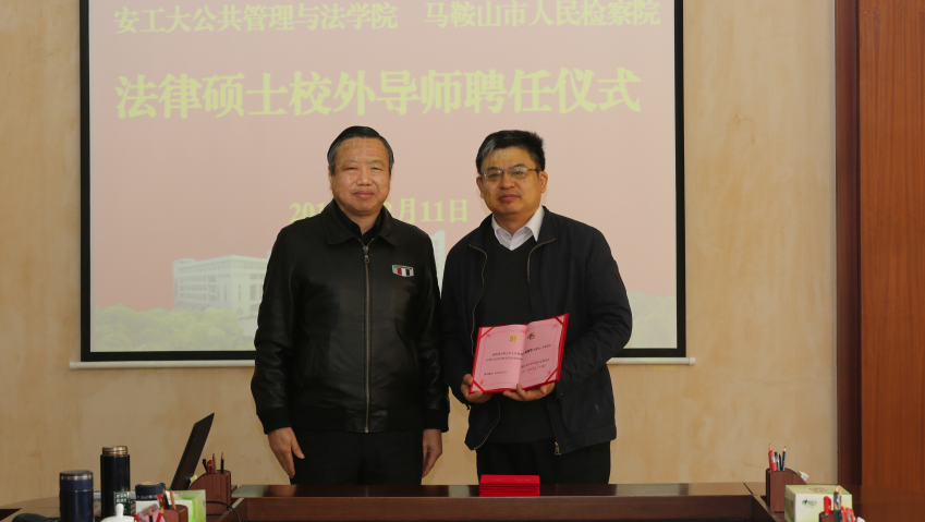 12月11日上午,公共管理与法学院在佳山校区学术会议中心举行法律硕士校外导师聘任仪式。校党委副书记祖明,马鞍山市人民检察院党组书记、检察长吴剑华,党组副书记、副检察长刘序,副检察长孙起斌、检察委员会专职委员高少勇出席了仪式。公法学院领导班子成员和法学系负责人、法硕研究生代表参加了仪式。仪式由公法学院院长徐济益主持。