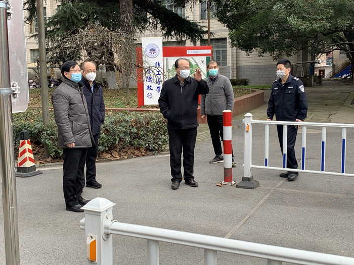 10日下午,刘新跃、魏先文、刘明带领办公室、后勤处、安保部主要负责人对两校区开展巡查,慰问安保、后勤和相关值班人员。在佳山校区西北门、东门和秀山校区人才公寓门慰问安保值班人员,查看校园封闭管理和人员体温检测情况,翻看人员登记本,要求安保人员严格执行马鞍山市通告要求,执行省教育厅“五个一律”纪律,严防死守,为校区和师生安全守好第一道门。在校医院听取院长祝为平关于校医院医疗诊治和发热送诊情况介绍,嘱咐医护人员在做好自身防护的同时,严格落实发热送诊和跟踪观测工作。在秀山校区教工便利超市,逐一询问了蔬菜价格,了解进货渠道和食品安全措施,嘱咐后勤同志做好疫情防控期间生活必需的基本保障,现场决定尽快开放佳山校区菜场,为教职工提供生活便利,进一步减少人员校内外流动。在秀山校区人才公寓查看了电梯消毒情况,肯定了后勤物业落实消毒措施和提供电梯按键抽纸的人性化措施。在留学生公寓查看了留学生在校管控和生活便利服务情况,与正在值班的国际教育学院工作人员和留学生交流,关心留学生在校生活和健康防护情况。在校园110指挥中心,仔细查看校园各重点部位,肯定前一阶段管控成效,提出完善要求。