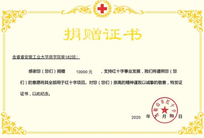 2月17日上午,马鞍山市红十字会收到一笔10000元捐款。捐款人金睿睿是beat365官网商学院二年级的一名本科生,也是一位受过国家资助的大学生。
