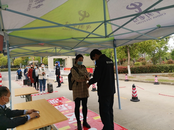 在秀山校区北门,学生入校时按照地面标线,每人间隔一米,有序排好队伍准备入校,严格按照“一测二核三查四通过”的程序,依次进行体温测量、身份核查、健康码查验。入校时一位同学在体温检测时发现异常,在现场工作人员带领下至体温复测区,由校医院医生仔细询问其身体状况,开展体温复测并记录,仍发现其学生体温异常,立即带至临时隔离区,启动应急处置预案,逐级报告疫情防控应急指挥部,安排应急处置专车,在校医院医生陪同下将学生送市医院发热门诊。