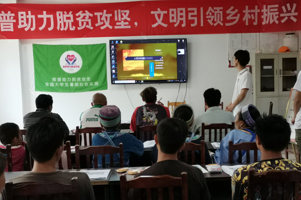 9月10日实践队抵达四大寨乡关口村,驻村第一书记蒋维红介绍关口村基本情况说,“此次推普脱贫是帮助关口村脱贫的一次好机会。在关口村推广普通话,为村民提供了一个走向外省寻找工作的机会,有利于推进关口村脱贫攻坚的顺利完成。”一个星期的时间,队员们通过发放问卷、开展访谈、举办推普小课堂,发现大部分村民的文化程度不高,又长时间呆在村里,周围没有说普通话的环境。实践队队长何峰这样说,“要想富,先修路,这里的路不只是我们脚下的路,更是语言互通这条路。”
