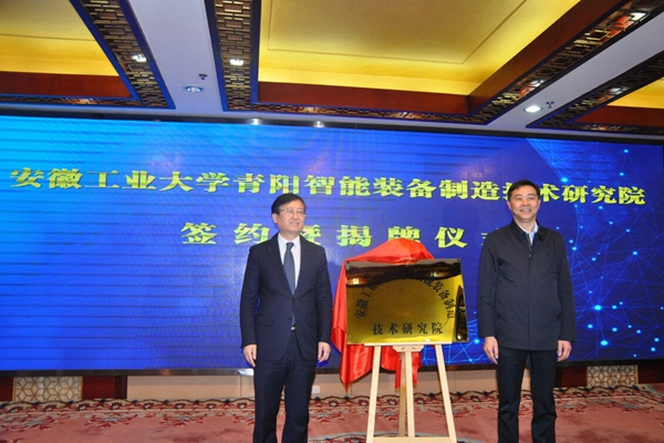 魏先文和巩文生共同为“beat365正版唯一官网青阳智能装备制造技术研究院”揭牌,副校长水恒福和青阳县副县长费飞签订共建“beat365正版唯一官网青阳智能装备制造技术研究院”协议书,科研处处长王孝义和青阳县经开区主任周林签订技术服务合同。
