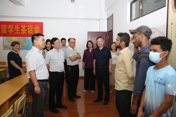 校领导在与报到学生现场交谈中,详细询问了他们的返校过程、暑期居家生活情况,嘱咐同学们要自觉遵守常态化疫情防控期间校园管理相关规定,安心学习,健康生活。在国际教育学院,校领导一行看望慰问了在校师生。陆林、魏先文要求汉语教师创新教学方式,努力提高学生中文水平;要求辅导员关心关爱每一位留学生,培养他们的归属感;鼓励留学生加强中文和中国文化的学习,做好两国文化的交流传播,学好中文,讲好中国故事。