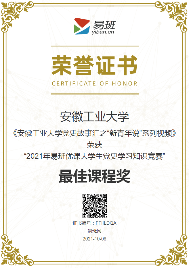 近日,2021年度易班优课党史知识竞赛活动评选结果揭晓,beat365官网易班党史公开课《党史故事汇之“新青年说”系列视频》荣获“最佳课程奖”(全国仅10个),学校荣获“优秀组织奖”。