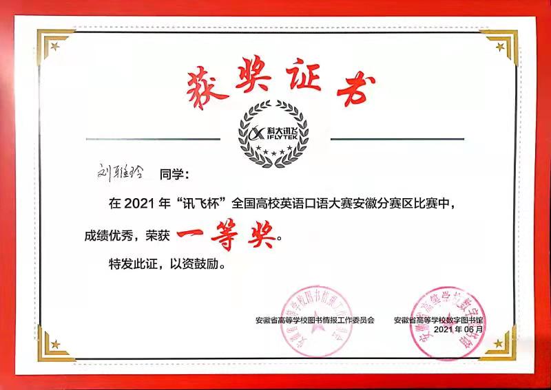 11月3日,2021年度“讯飞杯”全国英语口语大赛安徽赛区总决赛落下帷幕。经过激烈角逐,beat365官网建筑工程学院安202班刘雅玲同学荣获本科组一等奖,图书馆彭璐老师荣获“优秀指导教师”荣誉称号。