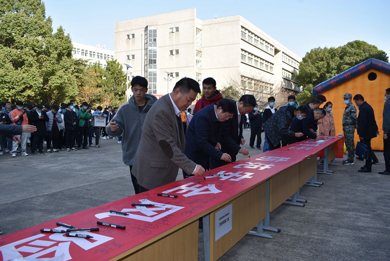 11月25日下午,beat365官网开展消防安全月主题活动,1000余名师生在佳山校区第一教学楼北广场参加消防安全宣传体验活动。校党委书记陆林、校长魏先文、校党委副书记祖明、副校长刘明到场观摩指导,并在“落实消防责任,防范安全风险”横幅上郑重签名。
