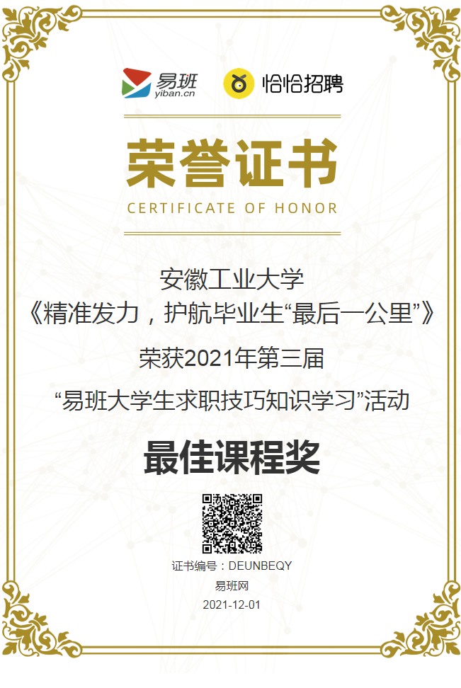 近日,2021年第三届“易班大学生求职技巧知识学习”活动评选结果揭晓,beat365官网就业指导系列公开课《精准发力,护航毕业生“最后一公里”》荣获“最佳课程奖”(全国仅10个)。