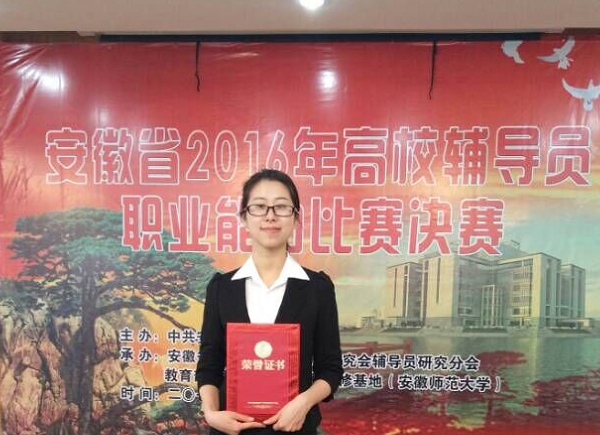 为了更好的做好学生工作,她始终加强学习,不断提升自身专业素质。获得2016年全国辅导员职业能力大赛复赛二等奖,安徽省辅导员职业能力大赛决赛特等奖、复赛一等奖;校优秀辅导员、优秀共青团干部、社会实践优秀指导教师称号、新闻宣传工作先进个人等荣誉称号。先后主持校级课题项目1项,指导2013年省级创新创业项目1项,2016年国家级、省级、校级创新创业项目各一项,获批安徽省辅导员名师工作室。(责编:祝小迁 审核:王先柱 邹珏)