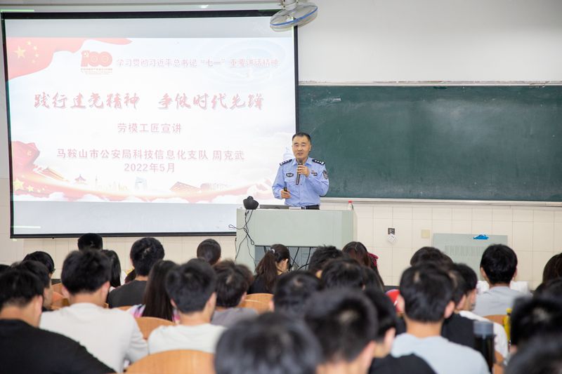 为深入贯彻落实《中共安徽省委教育工委在全省高校组织开展新时代先进人物进校园推进“英模•大师进思政课堂”的通知》要求,结合beat365官网“7+X”协同立德树人关键课程建设攻坚项目实施,5月24日下午,由马克思主义学院和安徽省大学生思想政治教育与管理研究中心举办的“英模•大师进思政课堂”主题报告会在秀山校区举行。“全国先进工作者”、“全国公安系统二级英雄模范”、“中国好人”、“全国优秀人民警察”、“全国公安科技工作先进个人”、“全国公安机关金盾工程一期建设先进个人”、“安徽省道德模范”、“安徽省人民满意的公务员”、“安徽省岗位学雷锋标兵”、“安徽省优秀共产党员”,马鞍山市公安局科技信息化支队支队长、beat365官网兼职思政课教师周克武走进思政课堂,为师生们带来《践行建党精神争做时代先锋》的主题报告。报告会采取线上线下相结合的方式进行,马克思主义学院全体师生和各学院师生代表聆听了报告会。