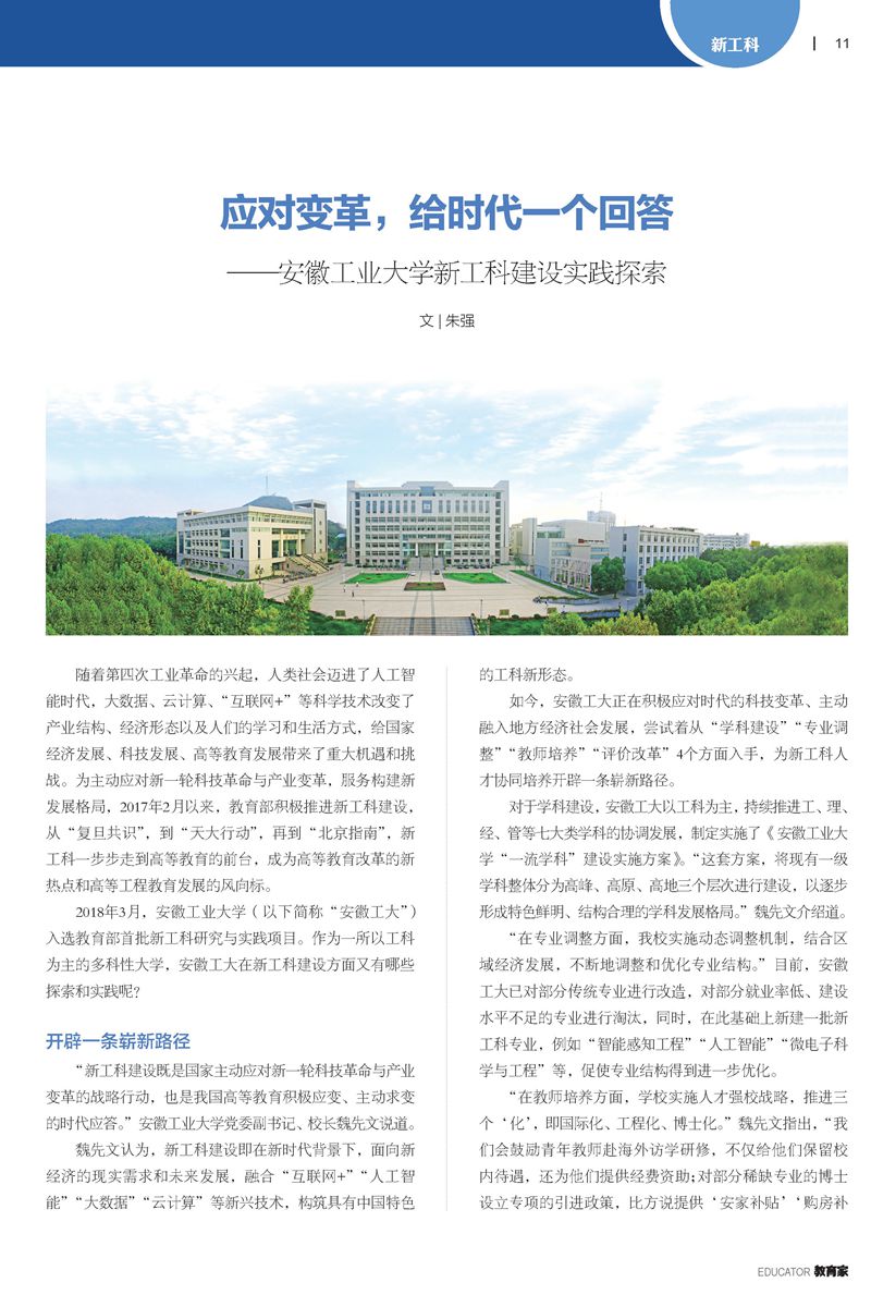日前,光明日报《教育家》杂志2022年5月刊第4期“特别策划”栏目以《应对变革,给时代一个回答——beat365正版唯一官网新工科建设实践探索》为题,深度报道了beat365官网在新工科建设方面的实践与探索。报道称“安徽工大积极应对当前时代的科技变革、主动融入地方经济社会发展,从学科建设、专业调整、教师培养、评价改革等4个方面入手,为新工科人才协同培养开辟一条崭新路径”“围绕智能时代下‘为谁培养人、培养什么人、怎样培养人’这三个根本问题,开展特色化理论研究和实践探索,提出了人才培养的大人才观、大工程观、大质量观、大协同观,以全新的理念和思想引领教育教学改革,推进人才培养走向‘多元、多维、多样’的大格局”“未来将会持续深化理念转变,推进产教融合和校际合作,在新工科建设的探索之路上披荆斩棘,砥砺前行。”