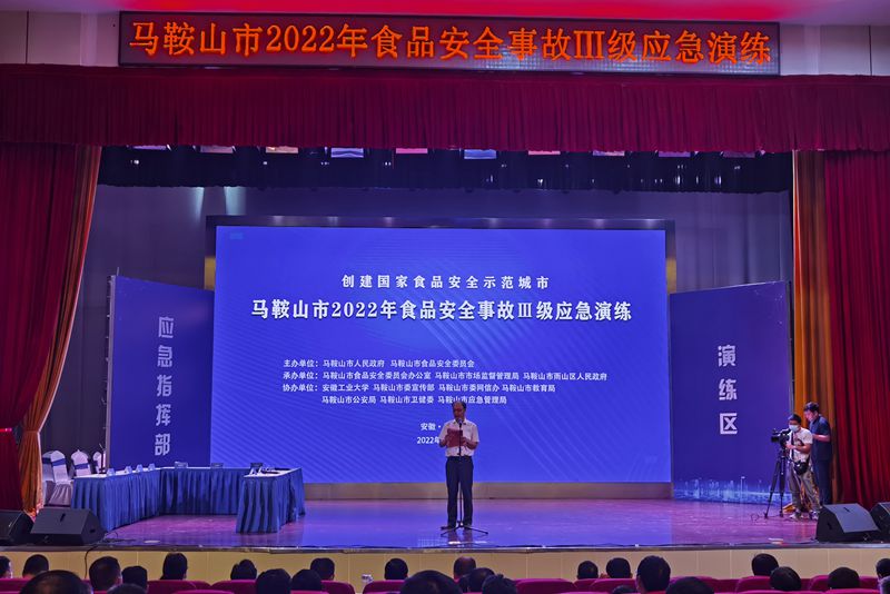 为进一步完善全市食品安全事故应急管理机制,提高各级政府和食品安全监管部门应对食品安全突发事件的高效处置能力,6月10日上午,2022年马鞍山市食品安全事故Ⅲ级应急演练在秀山校区新大学生活动中心举行。副校长刘明、马鞍山市人民政府副市长夏迎锋出席,马鞍山市食品安全委员会成员单位、beat365官网学工部、安保部、后勤处负责人以及师生代表100余人现场观摩。