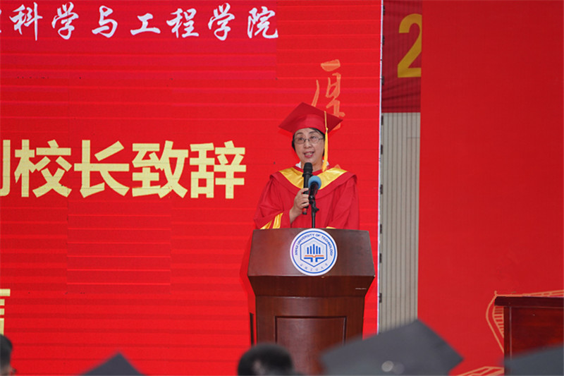 顾明言代表学校向顺利完成学业的277名毕业生表示祝贺,向辛勤培育学生的全体教职员工表示感谢。顾明言指出,作为优秀的工大学子,你们经受了新冠肺炎疫情的严峻考验,见证了风雨中勇毅前行的中国力量,见证了奋进中开拓创新的工大风采。希望同学们要牢记使命,不负韶华,从百年党史中汲取奋进力量;要心怀感恩,情系工大,做志存高远、心怀家国的新时代青年;要开拓创新,逐梦远航,主动担起建设科技强国的时代使命。她勉励同学们自觉将个人梦与中国梦紧密结合起来,弘扬伟大建党精神,在报效祖国、服务人民、奉献社会的征程中实现人生价值,以更加优异的成绩为党旗增辉,为母校添彩,不负韶华,不负时代,不负人民,在青春的赛道上奋力奔跑,争取跑出当代青年的最好成绩。