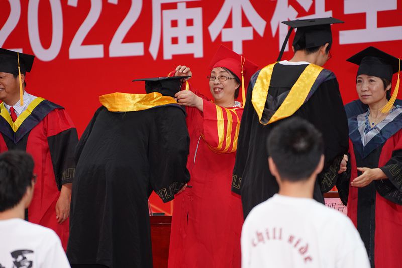 2022届本科生学位授予仪式隆重举行,与会领导老师为毕业生扶苏正冠,行拨穗礼,颁发毕业证书、学位证书。同学们向老师敬献鲜花,感谢师恩。