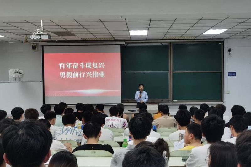 6月9日晚,副校长刘明以“百年奋斗谋复兴 勇毅前进兴伟业”为题为建工学院2021级本科生讲授思政课。