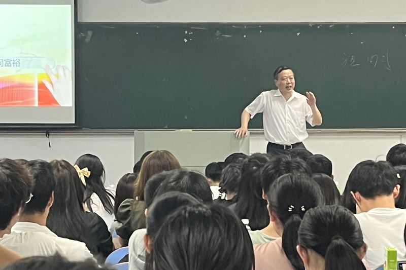 6月2日晚,校党委副书记祖明以“不断推进全体人民共同富裕”为主题,为公法学院2021级本科生讲授思政课。