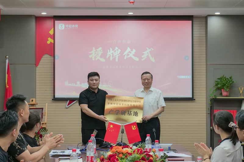 祖明代表学校为陈志栋颁发企业导师聘书,为安徽夺冠体育科技有限公司颁发“beat365正版唯一官网产学研基地”牌匾。