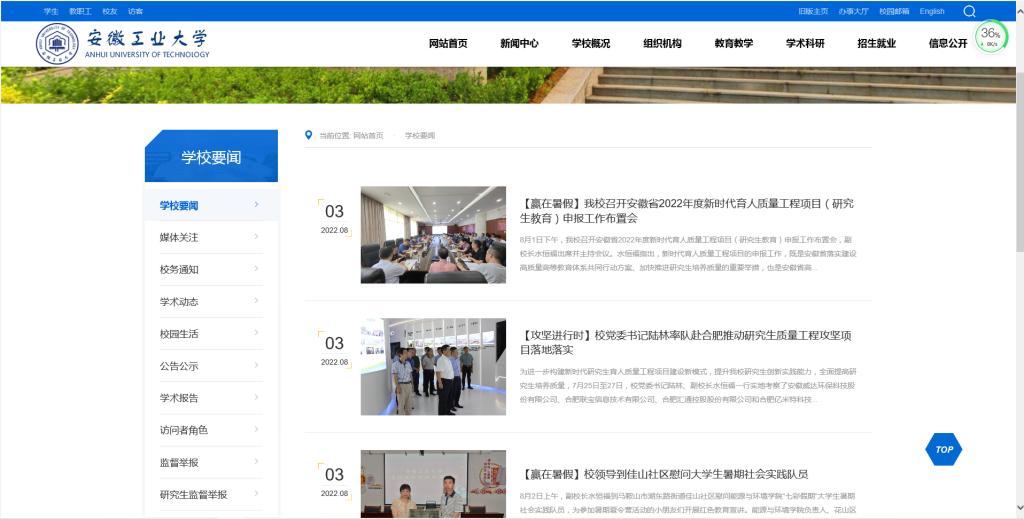内容特色上,轮播的“工大封面”采用宽屏横幅大图设计,是学校近期重大宣传主题、重大新闻事件以及特色文化展示的最为亮眼的窗口。主体部分以模块化的方式呈现学校要闻、校务通知、公告公示、媒体关注、学术动态、校园生活、热点专题等板块,全面展示学校的办学成果和师生的精神风貌。