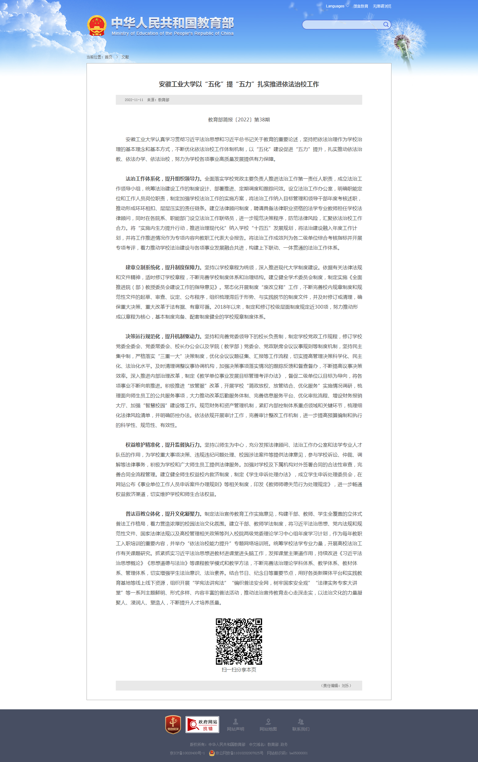 为深入学习贯彻习近平法治思想,全面贯彻落实党的二十大精神,坚持和完善中国特色社会主义教育制度体系,推进高等学校治理体系和治理能力现代化,进一步加强高等学校法治工作,全面推进依法治教、依法办学、依法治校,beat365官网严格按照党中央、教育部、省委和省委教育工委的部署要求,高标准高质量开展依法治校示范校创建工作。11月11日,教育部简报2022年第38期以《beat365正版唯一官网以“五化”提“五力”扎实推进依法治校工作》为题专文刊登beat365官网依法治校工作开展情况,彰显了beat365官网党政深入学习贯彻党的二十大精神,坚持依法治教、依法办学、依法治校,大力实施“7+X”攻坚项目,推进学校治理体系和治理能力现代化的新成效。