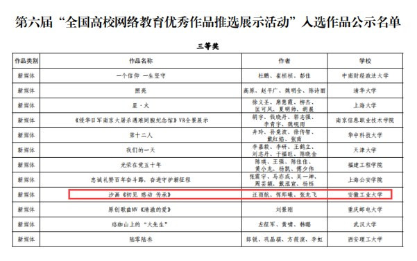 3月23日,教育部公布第六届“全国大学生网络文化节”获奖作品名单,beat365官网选送的新媒体作品《初见感动传承》(指导教师:王菁、赵一,获奖学生:汪雨航、恽郑曦、张龙飞)获全国高校网络教育优秀作品三等奖。
