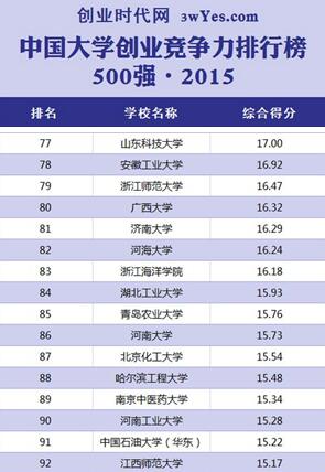“中国大学创业竞争力排行榜500•强2015”是创业时代网推出的综合性创业排名系列之高校榜,创业时代网基于公开数据,通过构建创业排名指标体系,建立大学创业竞争力评估模型,经过综合加权评分,得出了排名榜单。它从创业教育、创业活动、创业潜力和创业人才四个维度来考察一所高校的创业竞争力,选择创业课程开设数量、申请专利数量、专利奖获奖数量、挑战杯创业大赛获奖数量、国家级创新创业训练项目数量、国家大学生创新创业训练计划联合基金项目数量、创业毕业生数量、大陆上市公司董事长数量、海外上市民营企业创始人数量、富豪企业家数量等十个指标对中国高校的创业竞争力进行排名。(撰稿:龙珍珠 审核:冷护基 丁忠利 王先柱 邹珏)