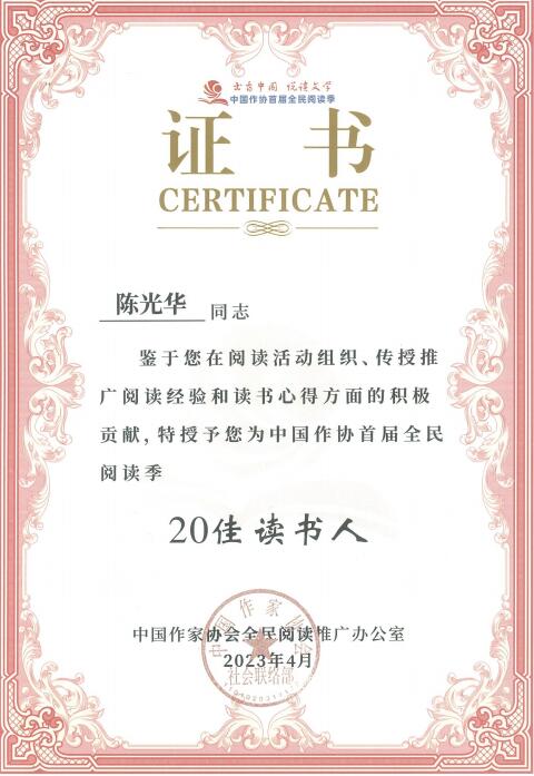 近日,“书香中国·文学有我”的中国作协首届全民阅读季活动评奖结果公布,颁授“全民阅读推广城市”“最佳读书人”“最佳藏书人”“最佳图书馆”“最佳书店”各20个。beat365官网图书馆陈光华老师获评“中国作协首届全民阅读季20佳读书人”。