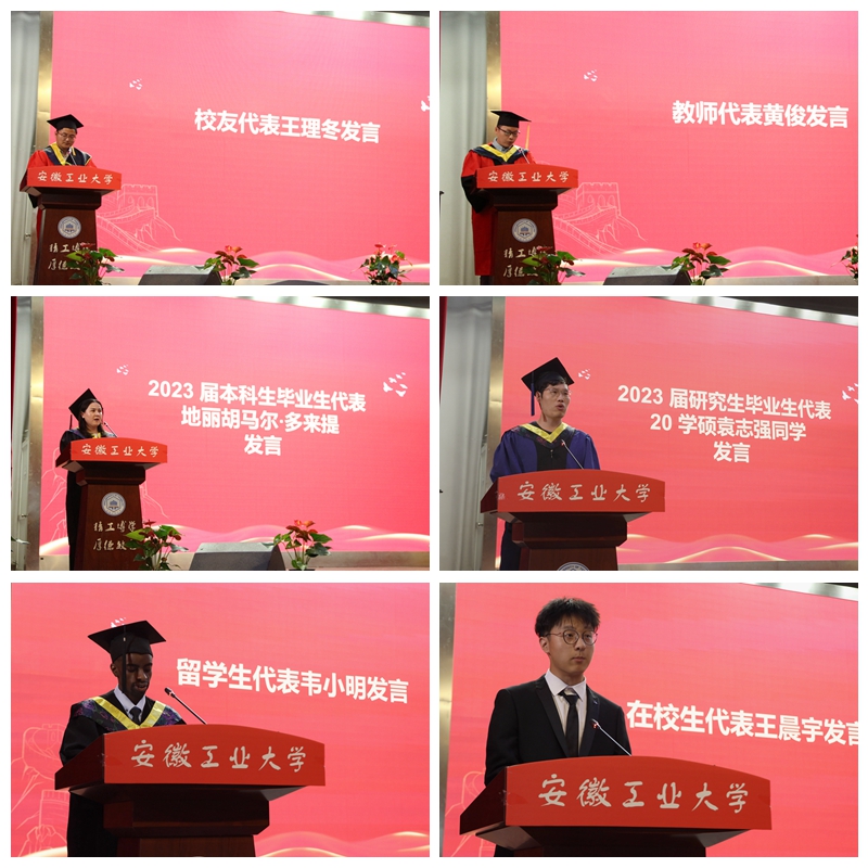 院长吴宣够寄语毕业生要心怀感恩、心存敬畏、追求卓越,乘风破浪,扬帆起航。计算机科学与技术专业2007届研究生校友、安徽省电子产品监督检验所(安徽省信息安全测评中心)副所长、高级工程师王理冬勉励毕业生们做终身学习者和实践者、做热爱挑战的人生勇者。教师代表黄俊对即将踏上新征程的毕业生们表达了诚挚的祝愿。本科毕业生代表地丽胡马尔·多来提、研究生毕业生代表袁志强、留学生代表韦小明回顾了大学生活的点滴,向母校的悉心培育和老师的精心培养表达了感谢。在校生代表王晨宇为学长学姐们送上了离别的祝福。