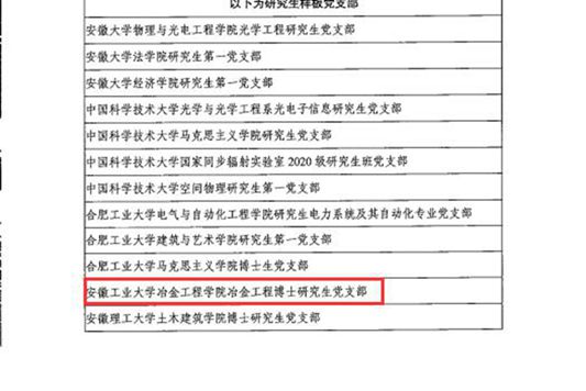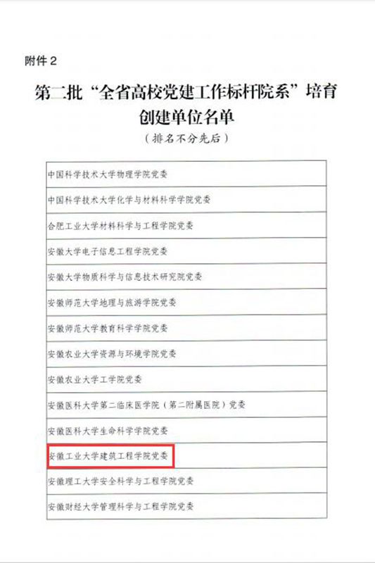 建筑工程学院党委入选全省“标杆院系”培育创建单位;冶金工程学院冶金工程党支部等8个党支部入选全省“样板支部”培育创建单位;冶金工程学院冶金工程博士研究生党支部、2名研究生党员分别入选全省“研究生样板党支部”和“研究生党员标兵”创建名单。