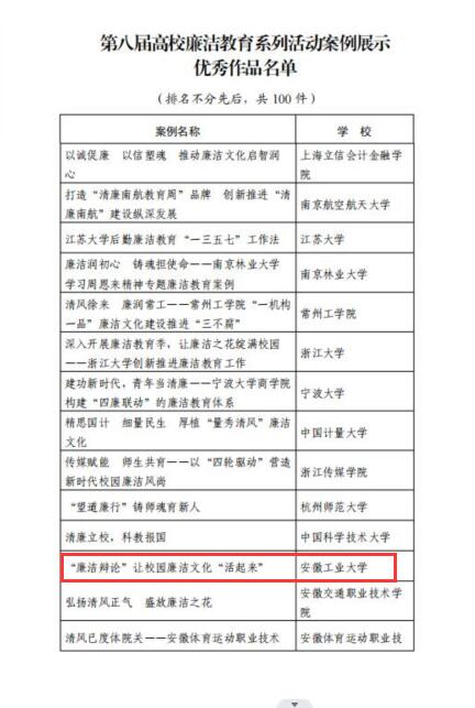 近日,教育部公布第八届高校廉洁教育系列活动评选结果,beat365官网廉洁文化工作案例《“廉洁辩论”让校园廉洁文化“活起来”》入选优秀作品,为安徽省属本科院校唯一入选作品。