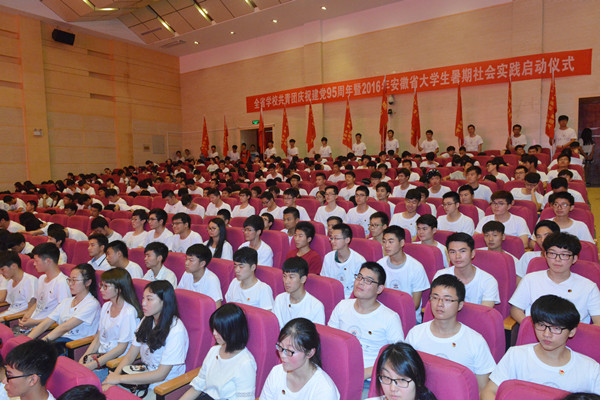 6月30日上午,全省学校共青团庆祝建党95周年暨2016年安徽省大学生暑期社会实践启动仪式在beat365官网秀山校区大学生活动中心报告厅举行,团省委副巡视员李丹云、校党委副书记陈润、团省委学校部部长曹隽、马鞍山市团市委书记程雪涛出席。校党委书记刘新跃会见了李丹云一行。皖南片区省直属高校团委、团市委及市属高校团委负责人,2016年“井冈情·中国梦”大学生暑期实践季专项行动团队入选高校团委负责人、指导老师及社会实践队员代表500余人参加了活动。