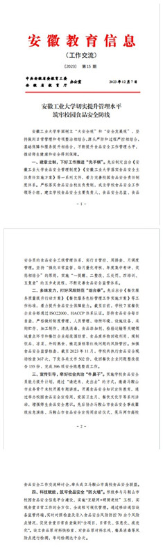 12月7日,《安徽教育信息》2023年第15期以《beat365正版唯一官网切实提升管理水平 筑牢校园食品安全防线》为题,专文刊登beat365官网食品安全管理工作开展情况,彰显了beat365官网深刻把握食品安全工作的政治属性、民生属性、公共安全属性,从制度设计、体系构建、宣传教育、硬件保障等方面着力,不断加强食安校园建设的显著成效。