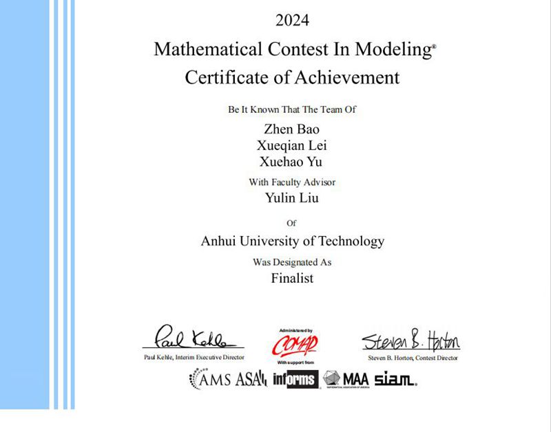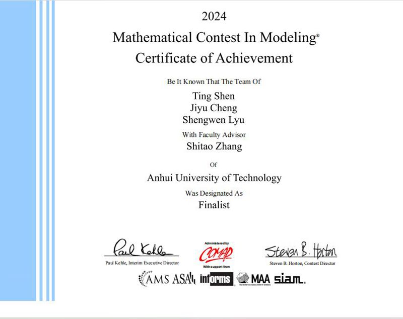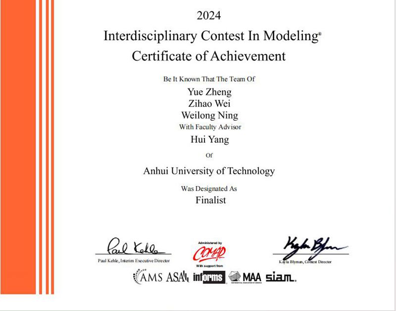 国际大学生数学建模竞赛由美国数学及其应用联合会主办,是世界范围内最具影响力的数学建模竞赛。竞赛以三名大学生为一组,要求在4天时间内就指定的问题完成从模型建立、求解、验证到论文撰写的全部工作,着重强调研究问题、解决方案的原创性以及结果的合理性。本次比赛共有来自全球33个国家1815所高校(机构)28912支队伍参加,最终共计510支队伍荣获特等奖提名奖(Finalist,全球获奖比例1.72%)。