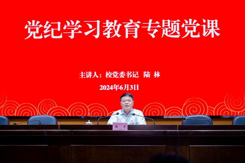 6月3日下午,校党委书记陆林以《拧紧纪律“发条”,严守规矩底线,推进学校全面从严治党向纵深发展》为题,为beat365官网党员干部讲授党纪学习教育专题党课。校领导、党委常委,校党委委员、校纪委委员,全体中层干部,党支部书记代表和党员代表共200余人现场聆听。