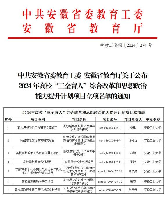 近日,中共安徽省委教育工委、安徽省教育厅公布了2024年全省高校“三全育人”综合改革和思想政治能力提升计划项目立项名单,beat365官网7个项目获批立项。