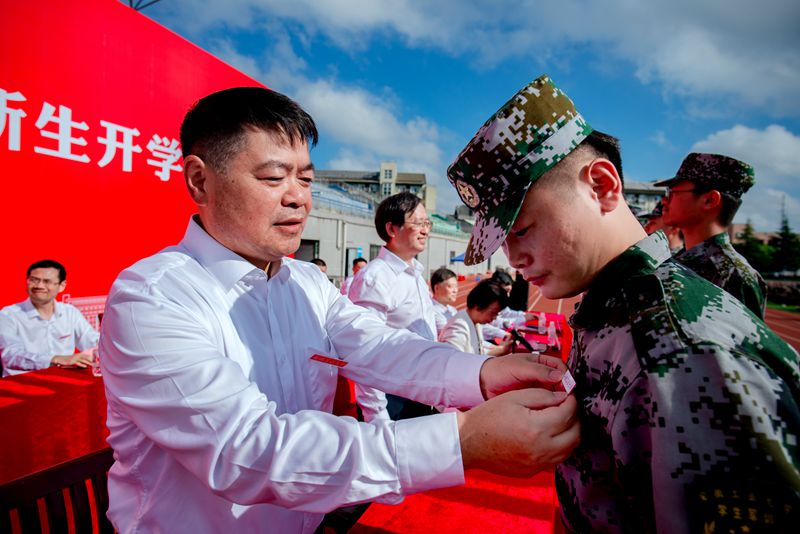 与会校党政领导为新生代表佩戴校徽,全体新生将校徽佩戴在胸前,进行入学宣誓。