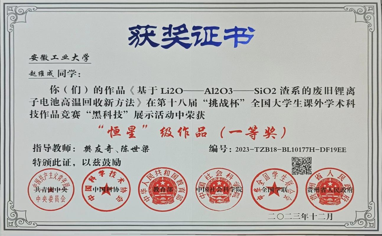 “双创”项目全覆盖:要求100%本科生参与创新创业训练,近三年获批国家级大创项目38项,省级项目45项,其中“废漆包线热解过程二噁英减排技术研究”、“退役光伏板金属回收工艺”等8个项目在宝武环科、格林美等企业实现成果转化。学科竞赛强赋能:将全国大学生冶金科技竞赛、全国高校模拟炼钢挑战赛等赛事纳入《工程导论》课程考核,本科生团队开发的“废铜再生过程烟气中二噁英高效减排新技术”获第七届全国大学生冶金科技竞赛特等奖,相关技术服务国家重大工程项目,并入选2024年再生资源行业十佳绿色低碳技术成果。
