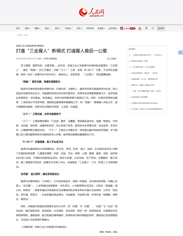 创新“党建+”工作模式,打通“三全育人”“最后一公里”。学院创新落实“三全育人”,引领青年学子迈向更广阔的未来。通过打造“党建+”工作模式,开展“一名党员重点关心联系一名学生、一名党员联系一个宿舍和一名党员联系一个班级”的“三个一”工程,积极打造文明好、安全好、卫生好、纪律好、氛围好、心情好、学风好和运动好的能环“八好之家”。