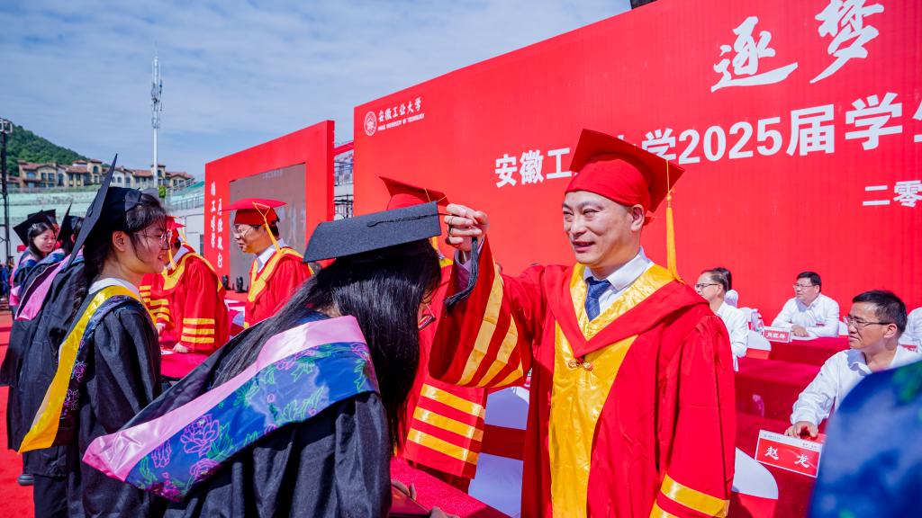 6月24日,beat365官网2025届学生毕业典礼暨学位授予仪式在秀山校区田径场举行。校领导陆林、曾杰、王俊、郑啸、吴春雷、闵凡飞、郑利平、张世宏、罗坤,环境监测专业1994届校友、北京建龙重工集团公司能源环保总监芮义斌出席。2025届全体毕业生,校党委常委,相关职能部门负责人,各学院党委书记、院长、学生工作负责人、毕业班辅导员,毕业生家长、班主任、教师代表,后勤、安保工作人员代表共5000余人参加。典礼由校党委副书记王俊主持。