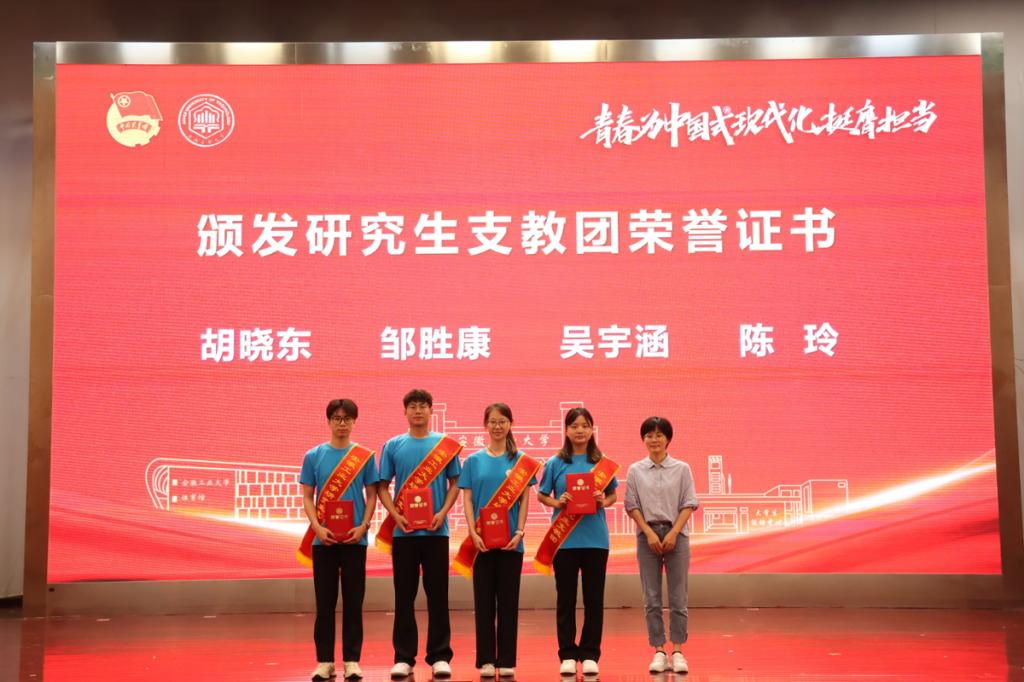 校团委书记赵颖虹介绍了2025年暑期社会实践、研究生支教团和西部计划相关情况。西部计划志愿者代表刘星宇和社会实践代表邹荣宇先后发言,冶金工程学院非“常”父母的365天“类家庭”社会实践队、管理科学与工程学院 “网红书记”赋能乡村振兴社会实践队进行了展示分享,社会实践指导教师作了业务培训。与会领导为研究生支教团成员和西部计划志愿者颁发证书、佩戴绶带。