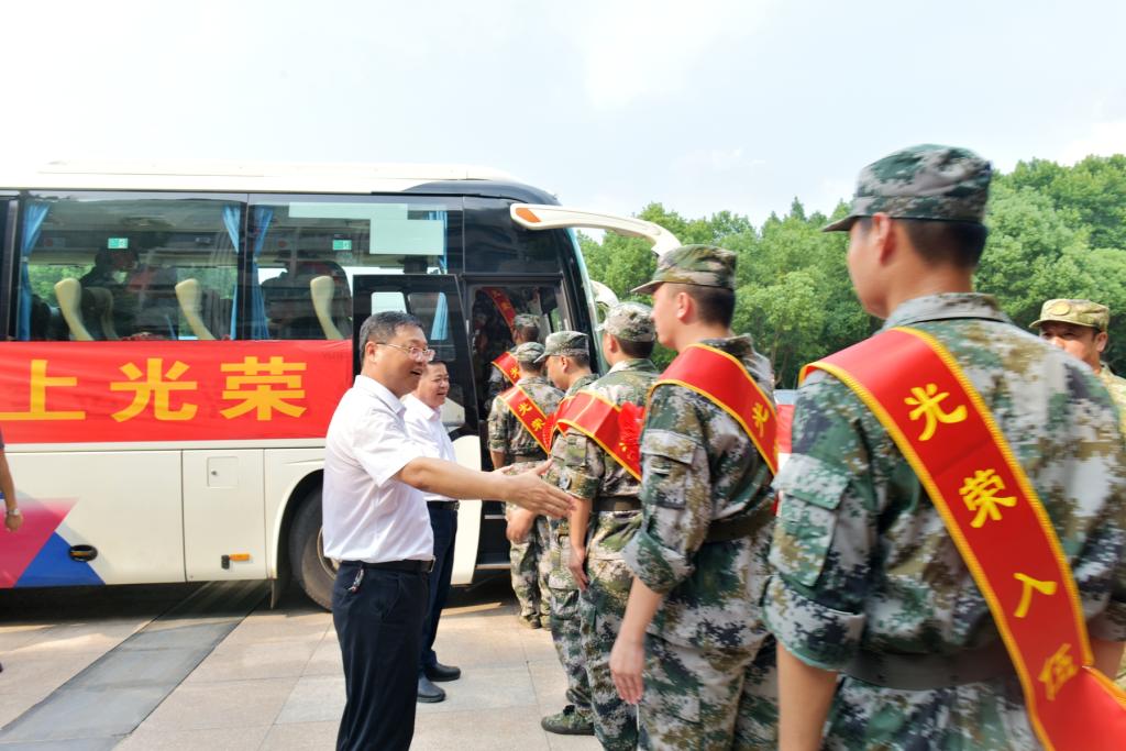 王俊介绍了beat365官网2025年征兵工作的总体情况。36名预定新兵肩披“光荣入伍”绶带,与会领导为他们佩戴“光荣花”。预定新兵们满载全校师生的祝福与期望,步伐铿锵、意志坚定,有序登车启程。两名迷彩宣讲团学生高擎“欢送新兵”横幅昂扬前导,锣鼓声、欢呼声、掌声久久回荡。