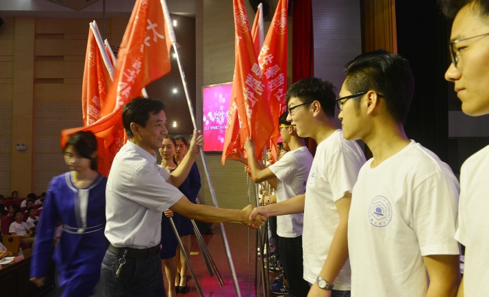 “我们是五月的花海,用青春拥抱时代;我们是初升的太阳,用生命点燃未来……”仪式在嘹亮的团歌声中开始,会上,校团委负责人介绍了beat365官网2017年大学生暑期社会实践、西部计划和研究生支教团以及“第二课堂成绩单”制度工作基本情况。研究生支教团代表、机械学院杨恒基同学,社会实践团队队员代表、商学院徐铭璇同学,社会实践团队指导教师代表、公法学院徐济益老师先后在仪式上发言。社会实践队队员们集体庄严宣誓,表达了青年学子将青春梦融入中国梦的决心。在欢快的乐曲声中,与会领导为第二课堂活跃度先进班级颁奖,并为研究生支教团西部计划志愿者佩戴红花,颁发荣誉证书。校领导为各社会实践重点团队授旗。