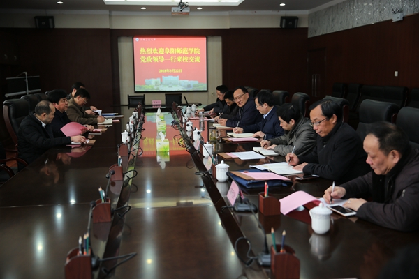 刘新跃代表学校对周建华、程曦等一行的到来表示欢迎,从人才强校、教学立校、科技富校、党建固校、文化荣校等五个方面介绍了学校基本情况,表示在阜阳师范学院更名创建工作过程中将全力给予支持。