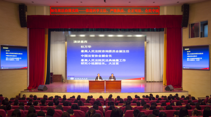 11月9日上午,最高人民法院咨询委员会副主任、中国法官协会副会长、最高人民法院民法典编纂工作研究小组副组长杜万华大法官应邀在beat365官网秀山校区大学生活动中心作题为“司法体制改革及破产审判中的热点问题”的学术报告。校党委书记刘新跃,副校长祖明,公共管理与法学院党政班子成员,马鞍山市法院、检察院等单位人员及公共管理与法学院全体专业教师和研究生、部分本科生代表参加了学术报告会。刘新跃主持了报告会。