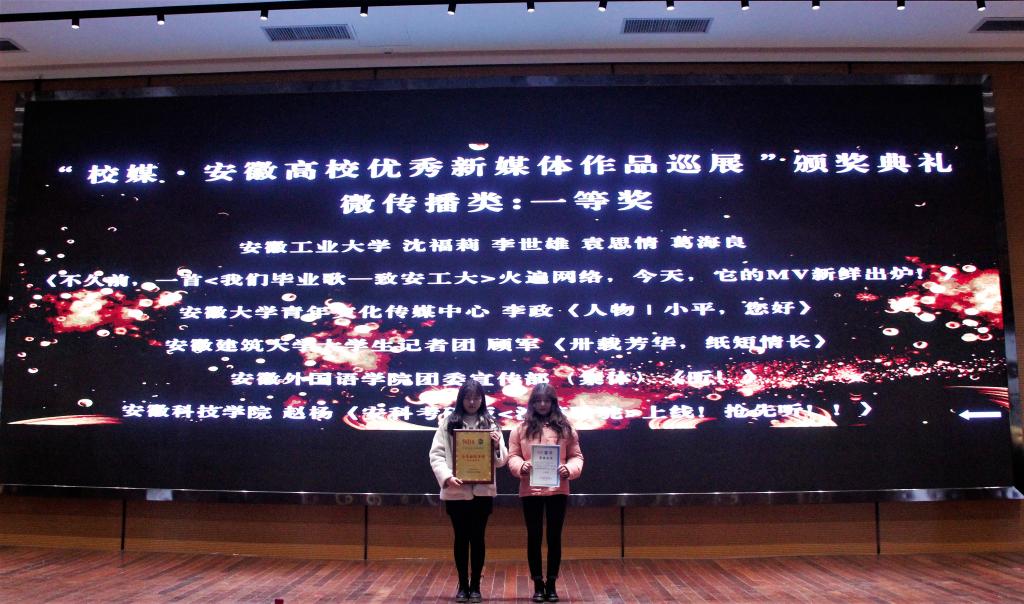 12月31日,中国(安徽)高校传媒联盟2018年度评比结果揭晓,beat365官网4件新媒体作品在近百幅作品中脱颖而出,获一等奖1项,三等奖3项;校新媒体中心获“十佳会员媒体”称号,并在颁奖典礼上作典型发言。