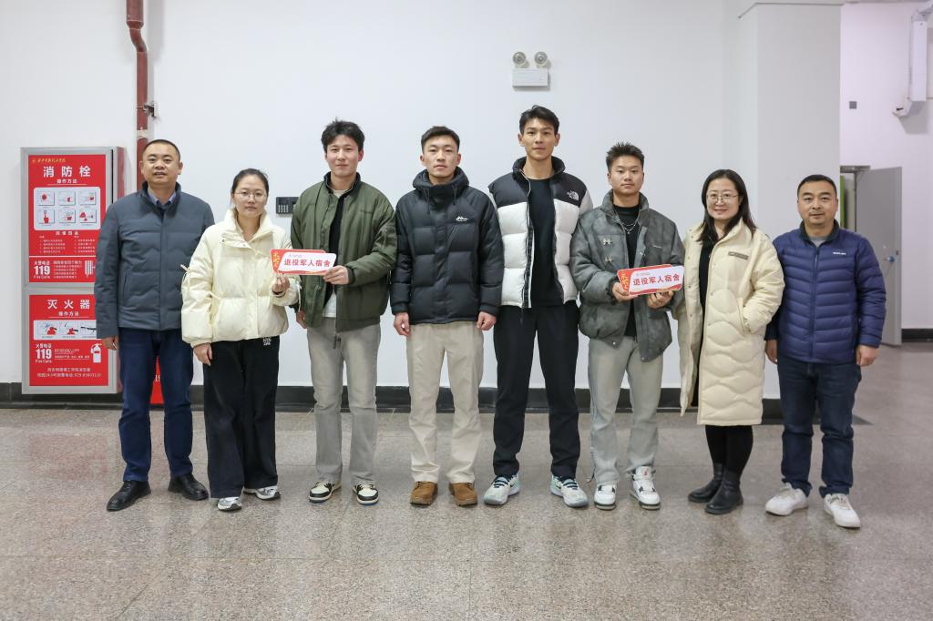 在退伍军人宿舍,院领导慰问了退伍大学生阴生杭和张德鹏,与他们进行交流,主动了解他们返校后的学习、生活适应情况,并就他们当前学习生活中遇到的困惑进行详细解答。在与退伍学生的交谈中,王庭良希望退役大学生能永葆军人初心、珍惜军人荣誉,时刻以党员、军人的标准严格要求自己,发扬部队优良传统,树立纪律之风,在平凡的生活中继续发光发热,切实发挥好先锋模范带头作用。随后学院领导向退伍学生宿舍悬挂“退伍军人宿舍”光荣牌并合影留念。