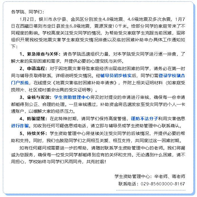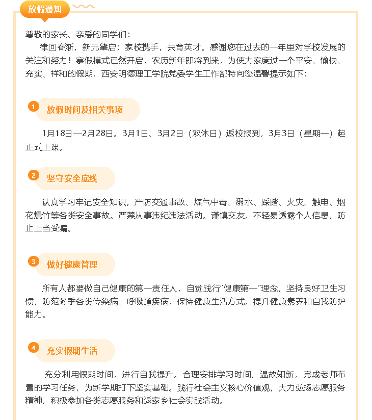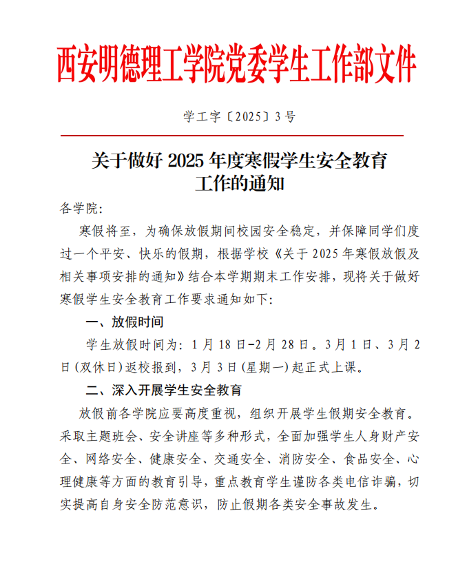印发《关于做好2025年度寒假学生安全教育工作的通知》《关于做好2025年春季开学学生教育管理工作的通知》,做好学生安全教育、宿舍隐患排查、重点学生关心关怀等工作。发布《致全体学生与家长的一封信》,提醒家长共同做好学生假期安全教育管理。