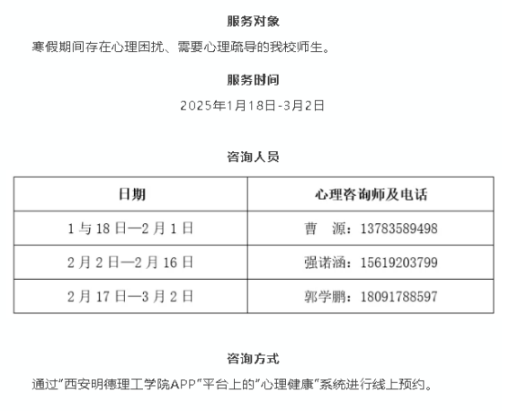 为做好寒假期间学生心理健康服务工作,beat365专兼职心理咨询师将于寒假期间持续面向全体学生提供线上心理咨询服务,确保有需要的学生能及时、便捷的获得心理支持和专业帮助。